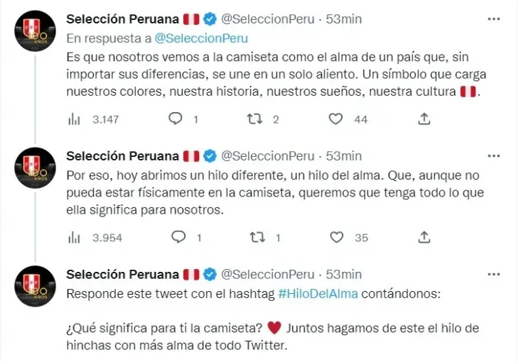 Así pues, la camiseta oficial de la Selección Peruana con adidas saldrá el martes 17 de enero, vía redes sociales. bajo el lema de “El alma de un país”, vía Twitter la cuenta de la Blanquirroja empezó con el “Hilo del Alma”, para comentar qué es para los peruanos su indumentaria nacional.