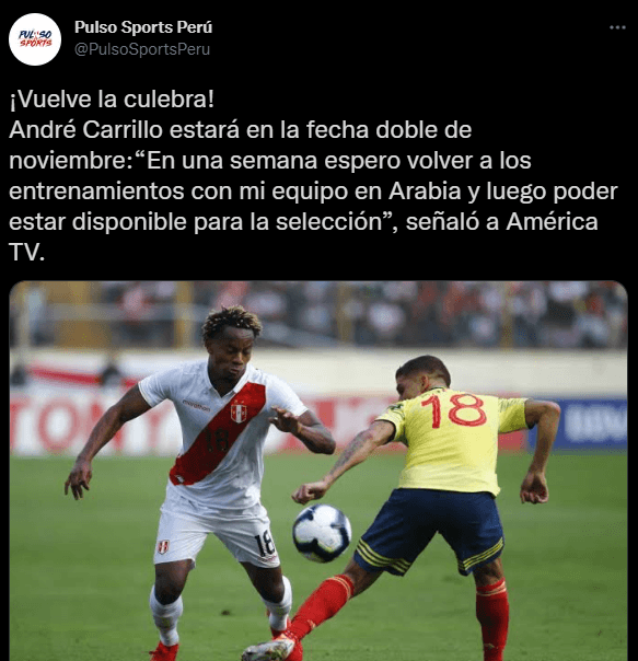 André Carrillo hizo superlativa en la Selección Peruana. El veloz extremo del Al-Hilal no estuvo en la última fecha triple por lesión, y se sintió esa ausencia. ‘La Culebra’ aún está en proceso de recuperación, pero cada vez le irá yendo mejor. Así lo reveló el propio futbolista, en charla con un medio local.