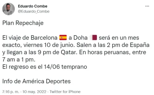 “Plan Repechaje: El viaje de Barcelona a Doha será en un mes exacto, viernes 10 de junio. Salen a las 2 pm de España y llegan a las 9 pm de Qatar. En horas peruanas, entre 7 am a 1 pm. El regreso es el 14/06 temprano”, reveló Eduardo Combe, periodista de América Deportes, sobre los horarios de los viajes de la ‘Bicolor’.