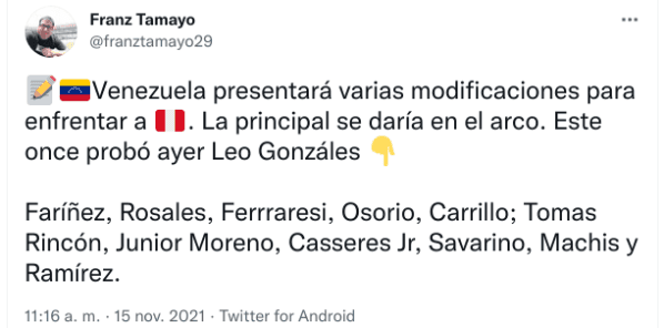 El equipo, entonces, según Franz Tamayo de Líbero quería de la siguiente manera:Faríñez, Rosales, Ferrraresi, Osorio, Carrillo; Tomas Rincón, Junior Moreno, Casseres Jr, Savarino, Machis y Ramírez. Se espera que salgan a buscar los tres puntos ¡A aprovechar su necesidad!