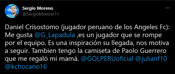 Para Daniel Crisóstomo hay un ejemplo que lo ilusiona con una futura convocatoria, ‘El Chasqui’: “Me gusta como juega Gianluca Lapadula, sé que no es mi posición, pero juega con amor al fútbol. Jugó muy bien, anotó muchos goles y me encantó verlo jugar. Lapadula es el camino diferente de todos y ver a alguien así en la Selección Peruana nos da ganas para seguir y ojalá algún día jugar por Perú”.