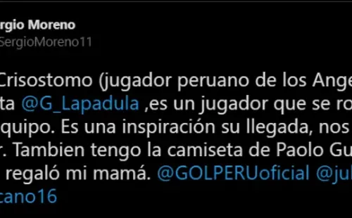 Dentro de la charla que brindó a nuestro país, comentó lo siguiente: “Cada vez que la Selección Peruana está jugando estamos atentos a la televisión, tengo amor por las dos naciones. Siempre me compraron camisetas de Perú, mi mamá me dio una de Paolo Guerrero. Mis padres siempre me dicen que juegue por Perú”.