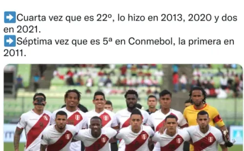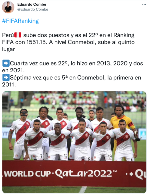 “Perú sube dos puestos y es el 22º en el Ránking FIFA con 1551.15. A nivel Conmebol, sube al quinto lugar. Cuarta vez que es 22º, lo hizo en 2013, 2020 y dos en 2021. Séptima vez que es 5ª en Conmebol, la primera en 2011”, señaló. La Blanquiroja pasó a Chile y ojalá siga subiendo en los partidos que vienen ¡Confiamos!