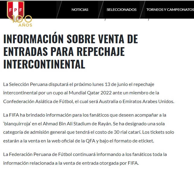La última plaza del torneo se decidirá con el choque de Costa Rica contra Nueva Zelanda el 14 de junio. Las entradas estarán disponibles mañana, 26 de mayo, a partir de las 15:00 horas de Doha (07:00 AM – HORA PERUANA), para los tres cruciales partidos de play-off de la Copa Mundial de la FIFA 2022.