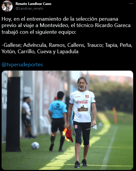 “Hoy, en el entrenamiento de la selección peruana previo al viaje a Montevideo, el técnico Ricardo Gareca trabajó con el siguiente equipo”. Precisó el comunicador deportivo, para después brindar el parado oficial del ‘Tigre’, quien mantiene una base que despertará algunos comentarios en redes sociales.