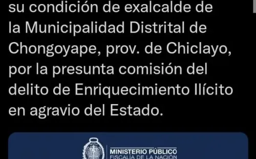 “La fiscal de la Nación dispuso formalizar la investigación contra Agustín Lozano Saavedra, en su condición de exalcalde de la Municipalidad Distrital de Chongoyape, prov. de Chiclayo, por la presunta comisión del delito de Enriquecimiento Ilícito en agravio del Estado“, comentaron las redes sociales del Ministerio Público.