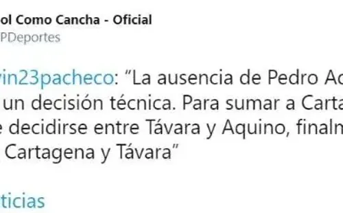 “La ausencia de Pedro Aquino pasa por un decisión técnica. Para sumar a Cartagena tenía que decidirse entre Távara y Aquino, finalmente incluyó a Cartagena y Távara”, señaló Pacheco.