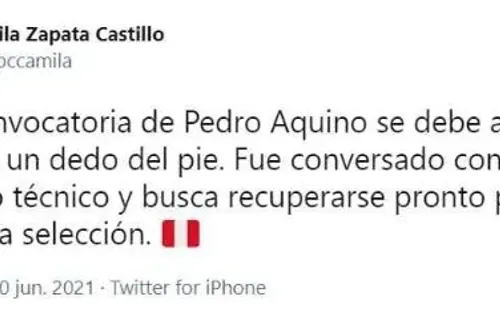 Zapata aseguró: “La no convocatoria de Pedro Aquino se debe a una lesión en un dedo del pie. Fue conversado con el comando técnico y busca recuperarse pronto para volver a la selección”.