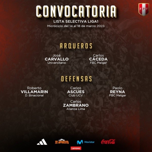 Los jugadores convocados de Alianza Lima son: Carlos Zambrano, Bryan Reyna y Jairo Concha. Ellos ingresan al microciclo de la Selección Peruanaque inicia este 14 hasta el 18 de marzo.