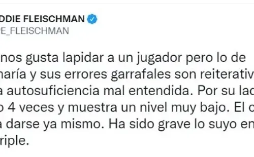 El zaguero del Atlas de México cometió un enorme error, tras confiarse en una jugada con Neymar Jr, quien le robó el balón y surgió el gol para el ‘Scratch’. Eddie Fleischman criticó duramente a Anderson Santamaría por su desempeño en el encuentro: “Nunca nos gusta lapidar a un jugador, pero lo de Santamaría y sus errores garrafales son reiterativos y por una autosuficiencia mal entendida. Por su lado han entrado 4 veces y muestra un nivel muy bajo. El cambio debería darse ya mismo. Ha sido grave lo suyo en la fecha triple”.