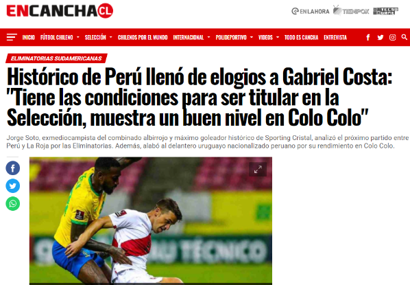Dejando un mensaje para Ricardo Gareca, el actual entrenador de la Selección Peruana: “Gabriel Costa tiene las condiciones para ser titular, por algo es llamado a la Selección. Es muy importante jugar en un buen nivel en Chile y más en un equipo como Colo Colo. Es complicado porque André Carrillo está pasando un buen momento en ese sector, pero Gabriel Costa puede jugar en diferentes posiciones”.