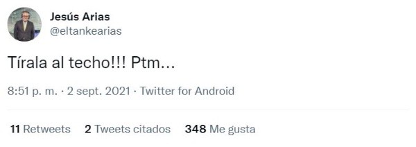 Cuatro minutos después los ‘charrúas’ empataron el encuentro con gol de Giorgian De Arrascaeta, tras una falla de Anderson Santamaría quien no logró despejar el balón como la jugada lo pedía. Tras esta desafortunada jugada las personas reaccionaron en el estadio y también en las redes sociales, entre ellos el periodista Jesús ‘El Tanke’ Arias que puso en su Twitter “Tírala al techo!!! Ptm…”, con esto se refirió a que el back central despeje el balón.