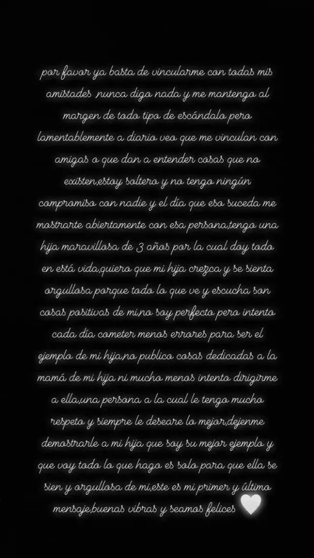 “No soy perfecto, pero intento cada día cometer menos errores para ser el ejemplo de mi hija. No publico cosas delicadas a la mamá de mi hija, ni mucho menos intento dirigirme a ella. Una persona a la cual tengo mucho respeto y siempre le desearé lo mejor. Demostrarle a mi hija que soy su mejor ejemplo y que todo lo que hago es solo para que ella se sienta bien y orgullosa de mí. Este es mi primer y último mensaje. Buenas vibras y seamos felices”, finalizó Sergio Peña en su post compartido en su cuenta de Instagram.