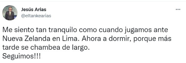 Bolivia, en el papel, sería un rival accesible para obtener una victoria en Lima, pero esto es fútbol y todo puede pasar. Uno de los periodistas que dijo sentirse tranquilo fue Jesús ‘El Tanke’ Arias en sus redes sociales: “Me siento tan tranquilo como cuando jugamos ante Nueva Zelanda en Lima. Ahora a dormir, porque más tarde se chambea de largo”, agregó el narrador deportivo.