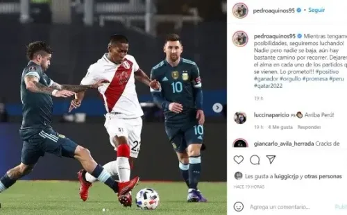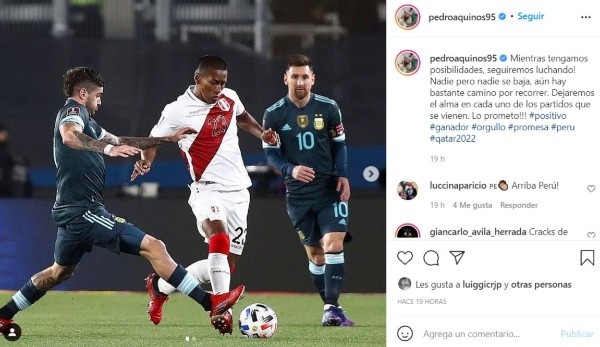 “¡Mientras tengamos posibilidades, seguiremos luchando! Nadie, pero nadie se baja, aún hay bastante camino por recorrer. Dejaremos el alma en cada uno de los partidos que se vienen. ¡Lo prometo!”, fue lo que publicó en su cuenta de Instagram Pedro Aquino, tras el último resultado frente a Argentina en Buenos Aires.