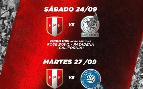 LaSelección Peruanase medirá en un partido amistoso anteMéxicoel 24 de setiembre en el Rose Bowl Stadium de California, Estados Unidos y se podrá ver desde las 20:00 (hora peruana).Mientras que el duelo anteEl Salvador, se disputará el 27 de setiembre en el Audi Fieldde Washington D.C. a las 19:00 (hora peruana).