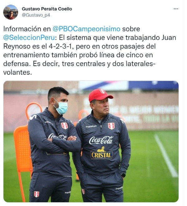 “Información en Campeonísimo sobre la Selección Peruana: El sistema que viene trabajando Juan Reynoso es el 4-2-3-1, pero en otros pasajes del entrenamiento también probó línea de cinco en defensa. Es decir, tres centrales y dos laterales-volantes“, comentó el periodista Gustavo Peralta en su cuenta de Twitter.