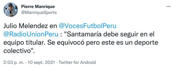 Por eso, recibió críticas y hasta fue cambiado. Julio Meléndez un conocedor de la posición, igual, le dio su respaldo en Voces del Fútbol: “Santamaría debe seguir en el equipo titular. Se equivocó pero este es un deporte colectivo”. Así, un exseleccionado se mostró a favor de que siga jugando ¡Opinión impopular!