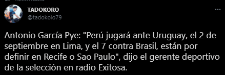 La cita textual al medio radial es la siguiente: “Perú jugará ante Uruguay, el 2 de septiembre en Lima, y el 7 contra Brasil, están por definir en Recife o Sao Paulo”.