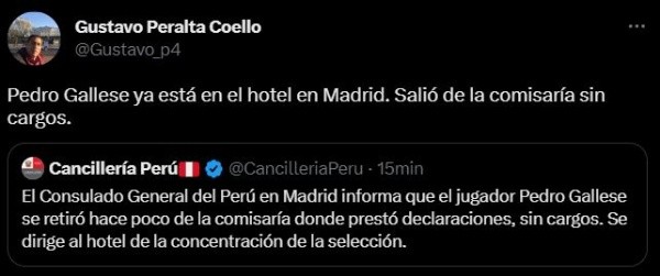 De la misma manera, el propio Consulado menciona cómo se trabajó el tema de Pedro Gallese: “El Consulado General del Perú en Madrid informa que el jugador Pedro Gallese se retiró hace poco de la comisaría donde prestó declaraciones, sin cargos. Se dirige al hotel de la concentración de la selección”.