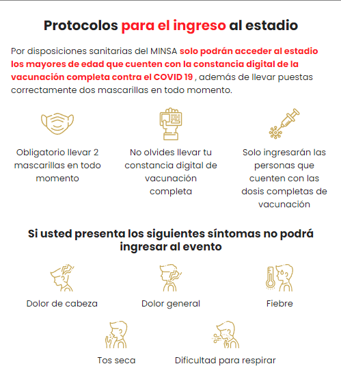 “Por disposiciones sanitarias del MINSA, solo podrán acceder al estadio los mayores de edad que cuenten con la constancia digital de la vacunación completa contra el COVID 19, además de llevar puestas correctamente las mascarillas en todo momento“, es la reglamentación que publicó la FPF.