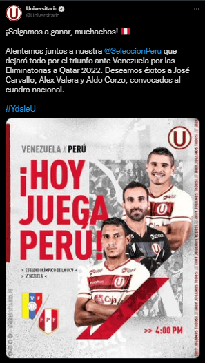 Universitario de Deportes en su cuenta de Twitter comunicó lo siguiente: “Alentemos juntos a nuestra Selección Peruana que dejará todo por el triunfo ante Venezuela por las Eliminatorias a Qatar 2022. Deseamos éxitos a José Carvallo, Alex Valera y Aldo Corzo, convocados al cuadro nacional”.