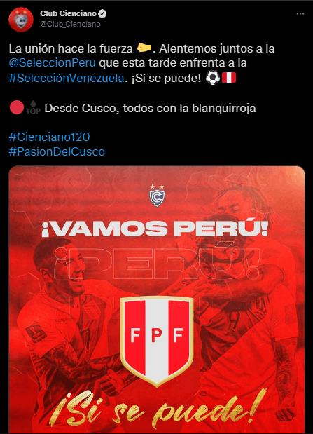 Y por su parte, los representantes de la ciudad imperial también hicieron lo propio, Cienciano y Cusco FC: “La unión hace la fuerza. Alentemos juntos a la Selección Peruana que esta tarde enfrenta a la #SelecciónVenezuela. ¡Sí se puede!”. Y mensaje del clásico de la región fue: “Hoy todos #SomosPerú ¡Alentemos a nuestra selección!”.