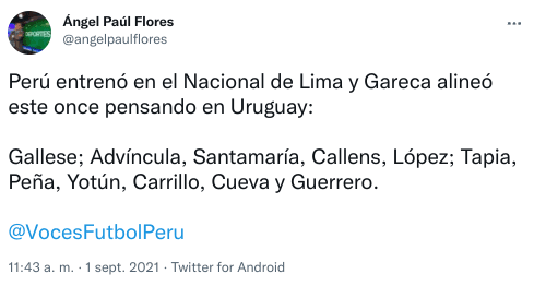 El equipo, entonces, quedaría de la siguiente manera:Gallese; Advíncula, Santamaría, Callens, López; Tapia, Peña, Yotún, Carrillo, Cueva y Guerrero. Así, sin Ramos, ni Trauco, el entrenador confiaría en Lópezy Santamaría ¡Ojalá sea todo positivo!