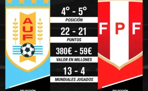 SegúnTransfermarkt,Uruguay está 11° en la tabla de posiciones de las selecciones más valiosas del mundo: 380,6 millones de euros vale su plantilla. Por su parte,Perú se ubica 60°:59,4 millones de euros. Por encima, aparecen países como Macedonia del Norte, Kosovo y Rumania, entre otros.