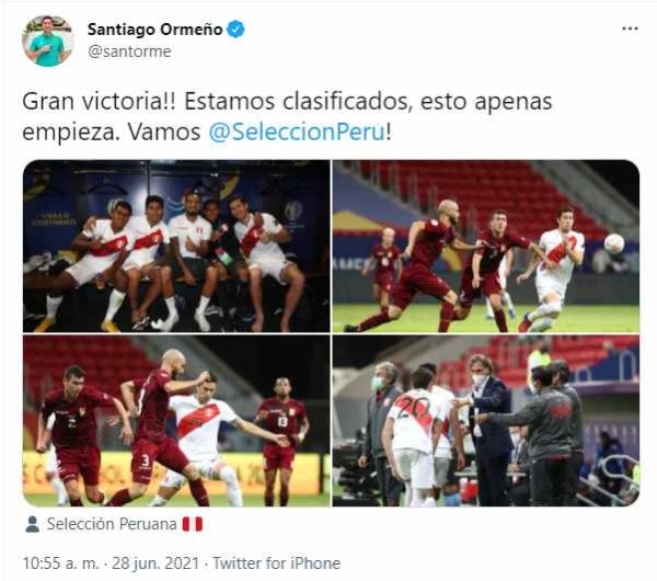 Este lunes, por ejemplo, un día después de pasar la fase de grupos como segundo escribió lo siguiente: “Gran victoria!! Estamos clasificados, esto apenas empieza. Vamos Perú!”. Con ello, subió algunas fotos suyas con la Blanquiroja ¡Buena Santi!