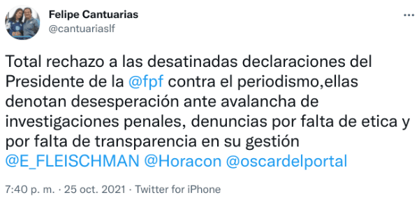 “Total rechazo a las desatinadas declaraciones del Presidente de la FPF contra el periodismo, ellas denotan desesperación ante avalancha de investigaciones penales, denuncias por falta de ética y por falta de transparencia en su gestión”, escribió en su twitter.
