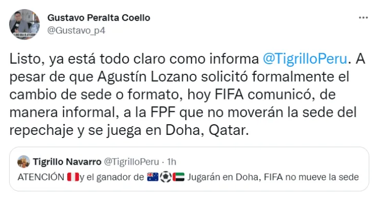 “Listo, ya está todo claro como informa. A pesar de que Agustín Lozano solicitó formalmente el cambio de sede o formato, hoy FIFA comunicó, de manera informal, a la FPF que no moverán la sede del repechaje y se juega en Doha, Qatar”, confirmó el periodista Gustavo Peralta de ESPN Perú en sus redes sociales.
