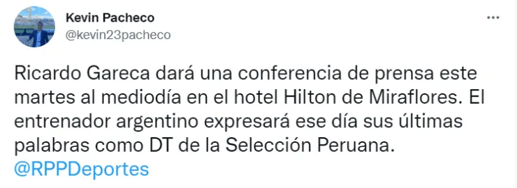 “Ricardo Gareca dará una conferencia de prensa este martes al mediodía en el hotel Hilton de Miraflores. El entrenador argentino expresará ese día sus últimas palabras como DT de la Selección Peruana”, reveló el periodista de RPP Noticias.