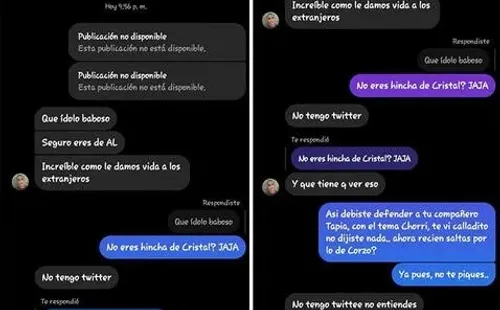 Donde aparecen unas capturas de una supuesta conversación de Instagram con la cuenta oficial de Yoshimar Yotún. Donde un usuario le recrimina unas historias al futbolista campeón con Sporting Cristal. Y este, habría respondido de manera desafiante con los siguientes mensajes, atacando nuevamente, en teoría, a Hernán Barcos.