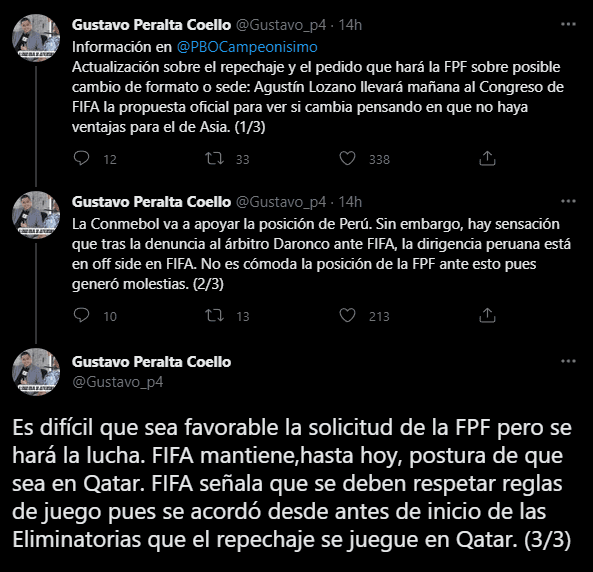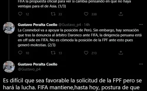 “Actualización sobre el repechaje y el pedido que hará la FPF sobre posible cambio de formato o sede: Agustín Lozano llevará mañana al Congreso de FIFA la propuesta oficial para ver si cambia pensando en que no haya ventajas para el de Asia”. Para después explicar que no es fácil lo que están solicitando desde VIDENA.