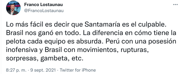 Franco Lostaunau, por ejemplo, escribió lo siguiente: “Lo más fácil es decir que Santamaría es el culpable. Brasil nos ganó en todo. La diferencia en cómo tiene la pelota cada equipo es absurda. Perú con una posesión inofensiva y Brasil con movimientos, rupturas, sorpresas, gambeta, etc.”.