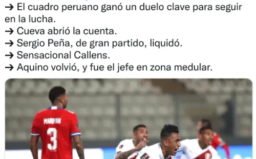 “Los de Gareca ganaron El Clásico del Pacífico. El cuadro peruano ganó un duelo clave para seguir en la lucha.Cueva abrió la cuenta. Sergio Peña, de gran partido, liquidó. Sensacional Callens. Aquino volvió, y fue el jefe en zona medular”, escribieron en una publicación con muchísimos me gusta ¡Bien muchachos!