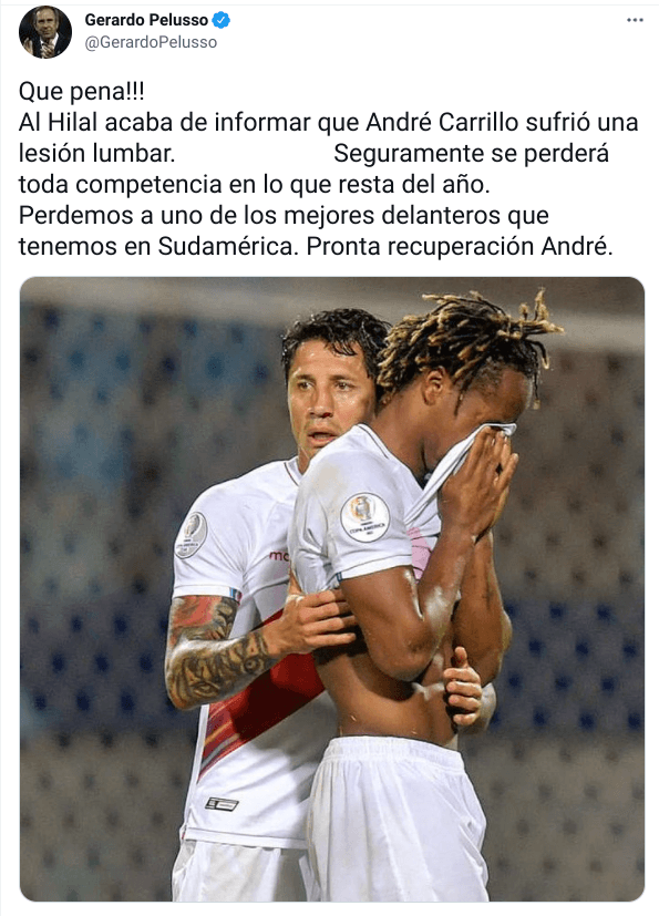 “Que pena!!! Al Hilal acaba de informar que André Carrillo sufrió una lesión lumbar. Seguramente se perderá toda competencia en lo que resta del año. Perdemos a uno de los mejores delanteros que tenemos en Sudamérica. Pronta recuperación André”, señaló.