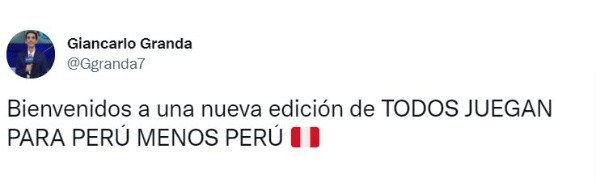 Tras esta derrota peruana, el periodista Giancarlo Granda publicó en su cuenta de Twitter lo siguiente: “Bienvenidos a una nueva edición de TODOS JUEGAN PARA PERÚ MENOS PERÚ”, haciendo alusión a que los demás resultados por Eliminatorias ‘pintaron’ para que los pupilos de Ricardo Gareca logren ganar y así escalar de posiciones en la tabla.