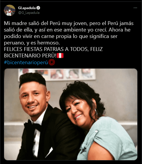 “Mi madre salió del Perú muy joven, pero el Perú jamás salió de ella, y así en ese ambiente yo crecí. Ahora he podido vivir en carne propia lo que significa ser peruano, y es hermoso. ¡FELICES FIESTAS PATRIAS A TODOS, FELIZ BICENTENARIO PERÚ!”.