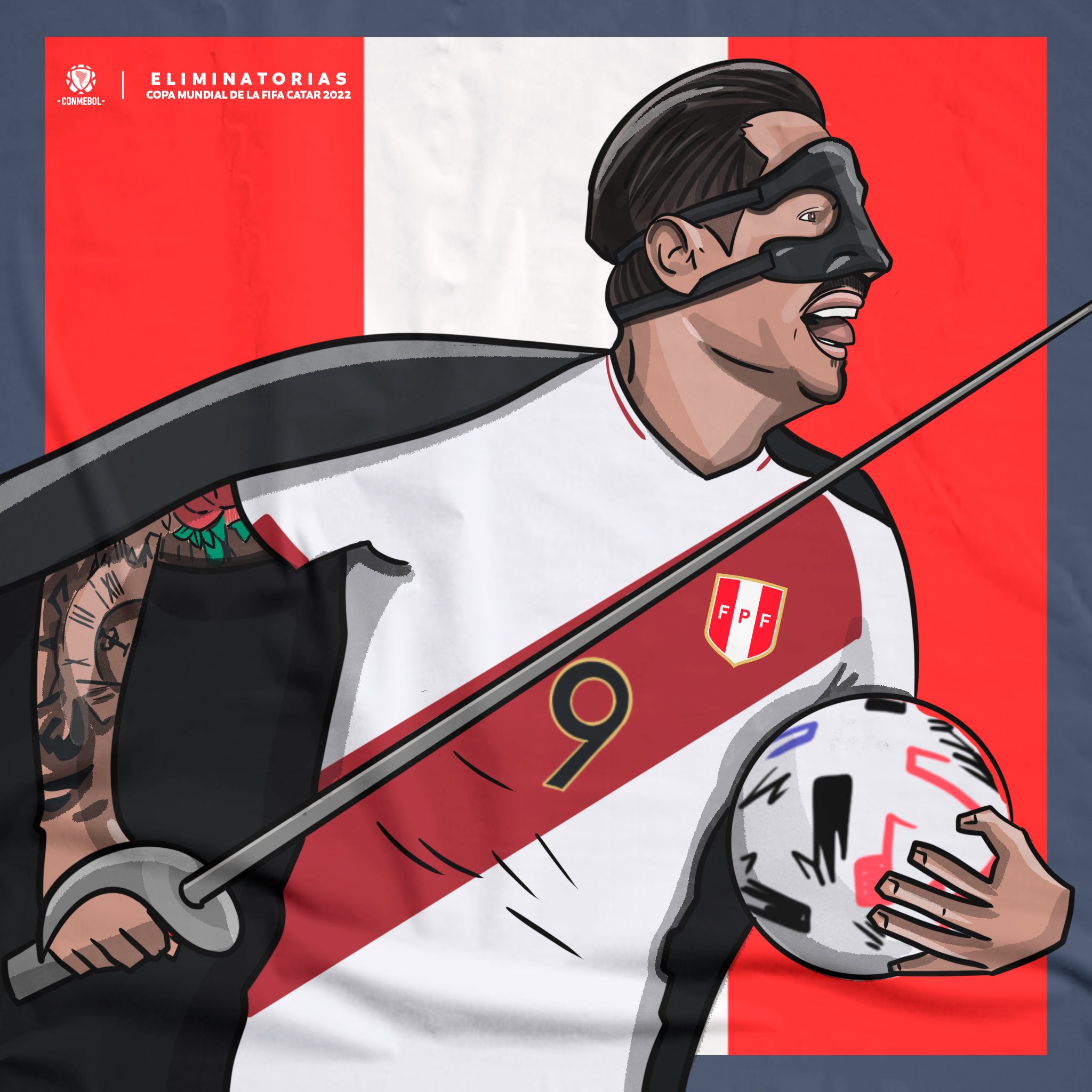 Gianluca Lapadula tras anotar su primera conquista en las Eliminatorias Sudamericanas con la camiseta de la Selección Peruana, frente a Bolivia por la fecha 13, la Conmebol publicó una divertida imagen del delantero del Benevento disfrazado del ‘Zorro’ con su capa, espada y la máscara que últimamente lo ha caracterizado. En dicho post dice: “Cuando sale la luna aparece el bravo Lapadula. ¡El Zorro!”, dice en la cuenta de Twitter del ente sudamericano.