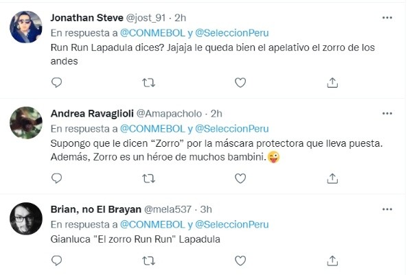 Esto ha generado la reacción de algunos hinchas peruanos donde ha respondido: “Gianluca ‘El Zorro Run Run’ Lapadula”, “Run run dices”, “El zorro Run run Lapadula”, fueron algunos comentarios de los internautas en dicha red social. Al parecer en la Conmebol han bautizado al atacante con el apodo del ‘Zorro’.