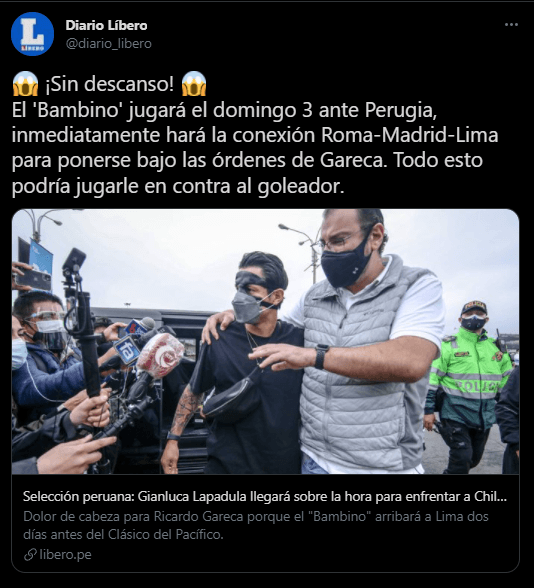 La estrella del Benevento juega este domingo 3 por la segunda división italiana contra el Perugia. Una vez termine ello, tendrá que hacer un trasbordo que corresponde ‘Roma-Madrid-Lima’, esta conexión tomará un buen tiempo. Y estará en la capital peruana recién el lunes por la tarde.