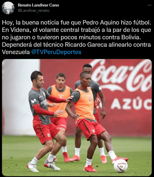 “Hoy, la buena noticia fue que Pedro Aquino hizo fútbol. En Videna, el volante central trabajó a la par de los que no jugaron o tuvieron pocos minutos contra Bolivia. Dependerá del técnico Ricardo Gareca alinearlo contra Venezuela”. Dando el campanazo más importante después de sumar 3 puntos.
