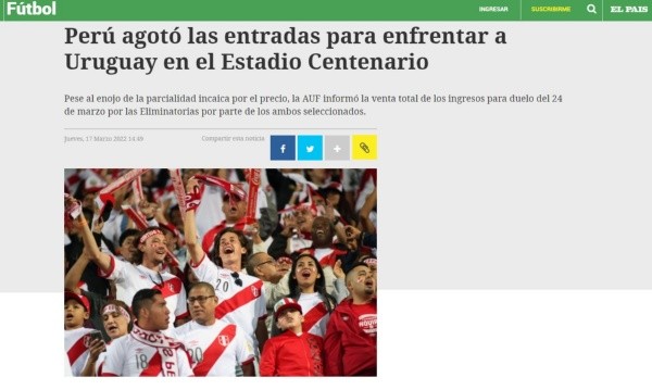 Uno de los partidos más candentes y próximos en las Eliminatorias Sudamericanas será el de Uruguay con Perú, que se jugará el jueves 24 de marzo en el estadio Centenario de Montevideo. Se indica que los hinchas ‘charrúas’ agotaron las entradas el 4 de este mes, pues lo mismo habría sucedido con los visitantes, en este caso la afición peruana.