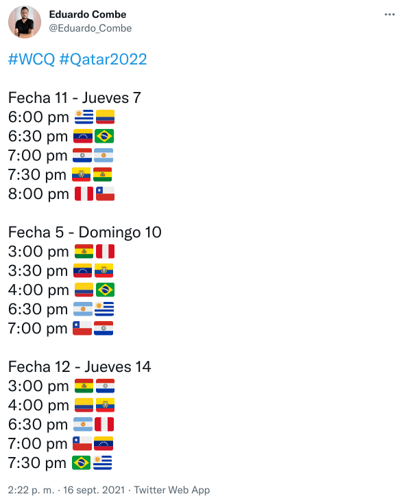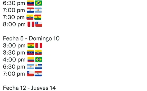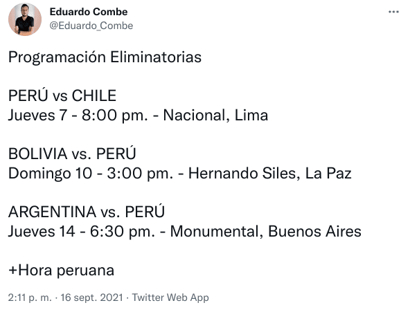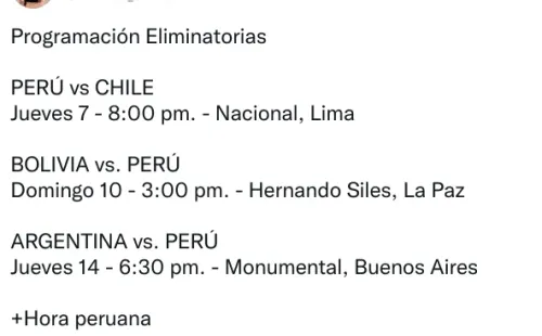 Primero, el jueves 7 de octubre, a las 20:00 horas, Perú recibirá a Chile en el Nacional. Luego, el domingo 10, el Hernando Siles de la Paz será el escenario del Bolivia-Perú a las 15:00. Por último, a las 18:30, la Blanquiroja visitará a la Albiceleste ¡A soñar!