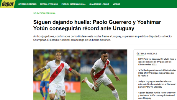 “Ambos futbolistas, confirmados como titulares en el duelo ante los charrúas, sumarán 106 encuentros vistiendo la blanquirroja. Superarán por un partido al gran capitán Héctor Chumpitaz, quien se quedará en la tercera ubicación de esta selecta lista (105)”. Precisa el medio informativo. El cual destaca al primero de la lista, que es Roberto Palacios con 128 cotejos completados.