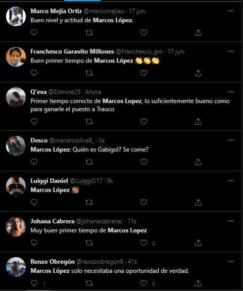 Los hinchas de la Selección Peruana lo destacan, desde los que alientan en la tribuna (hoy en sus casas), hasta lo más famosos con miles de seguidores (Mateo Garrido Lecca). Todos coinciden en la evolución de Marcos López. Hemos ganado un futbolista convocable, esperemos que siga en ascenso.
