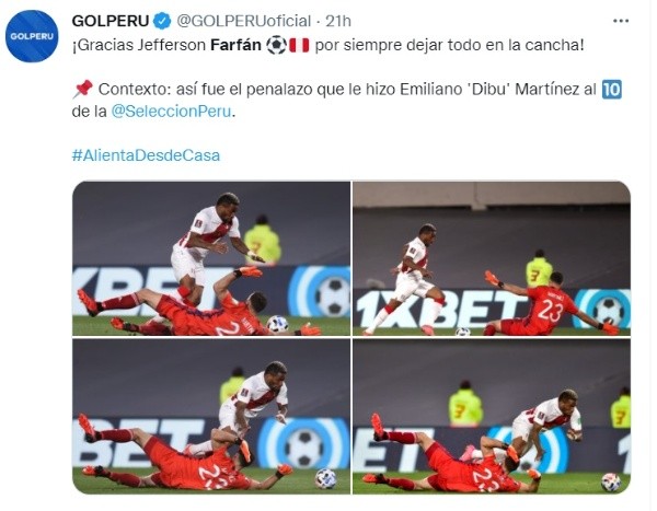 En la segunda mitad, con Jefferson Farfán dentro del terreno de juego por Gianluca Lapadula, los pupilos de Ricardo Gareca generaron un penal, cuando el golero Emiliano Martínez trabó a ‘La Foquita’ dentro del área. De esta manera se narró en la TV argentina: “Un balón lejano a los defensores y que todavía no es del arquero. Bien lo de Farfán. No parece penal. Al parecer Martínez se desplazó mucho”.