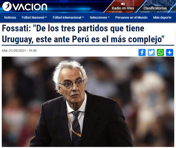 Afirmando que tanto Cavani como Suárez pesarán en contra de su país si no los logran suplir: “No podemos negar que son jugadores importantísimos para Uruguay, pero estamos hablando, tanto en la selección de Uruguay como la de Perú, de procesos largos. Técnicos que vienen trabajando hace años con la selección y es de esperar que tengan las soluciones a los problemas”.